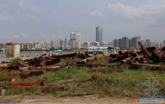 整個人工島遍地都是建筑垃圾,一堆堆裸放在現場的大量建筑用鋼管及鋼架,經長久風吹雨淋已嚴重銹蝕。