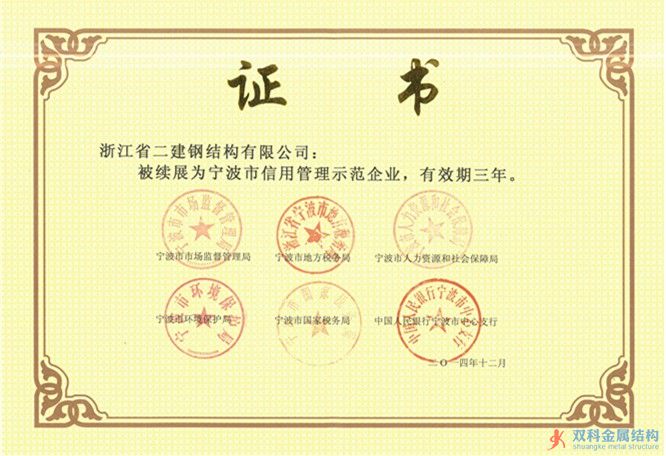 根據(jù)甬市監(jiān)信用[2014]174號文件,經(jīng)寧波市信用管理示范企業(yè)考評認(rèn)定小組的考核測評,鋼結(jié)構(gòu)公司被續(xù)展為寧波市信用管理示范企業(yè),有效期三年。![]() |