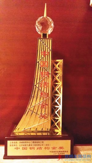 中國建筑工程鋼結構金獎,簡稱“鋼結構金獎”是中國建筑鋼結構行業工程質量的最高榮譽獎(國家優質工程)。由中國建筑金屬結構協會建筑鋼結構委員會組織實施,每年評選一次。早在2014年11月20日,中國建筑金屬結構協會建筑鋼結構委員會組織成立的評審委員會,就對赤峰體育中心鋼結構工程管理資料、現場質量進行了核查,專家組對現場管理、實體質量給予了很高的評價,因此本次順利被評為2014年度中國鋼結構金獎工程。